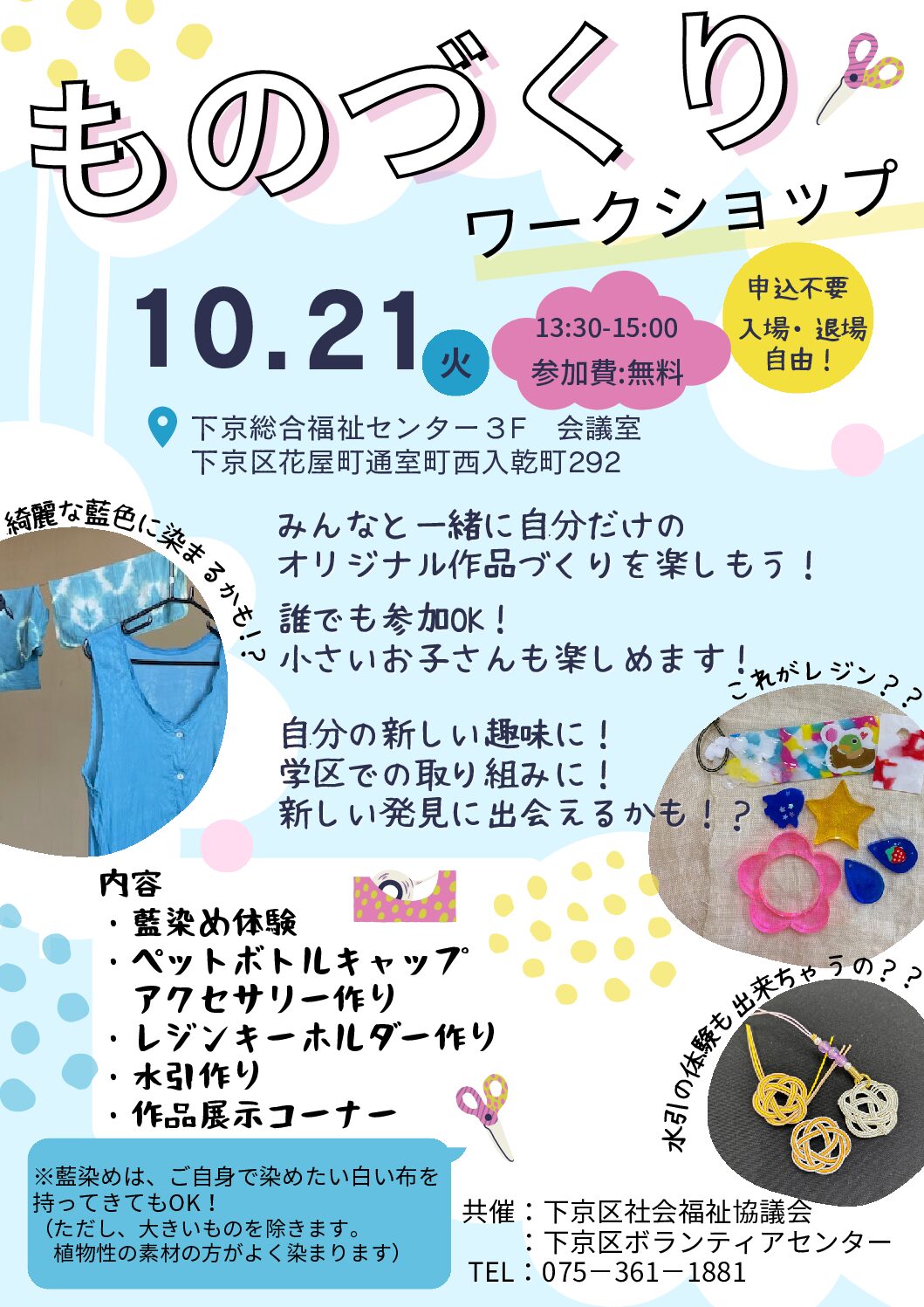 ものづくりワークショップ 10月21日(火)に下京区社会福祉協議会でものづくりワークショップを開催します! ものづくりワークショップって?? 藍染、レジン、水引、ペットボトルキャップアクセサリー作りという普段中々体験する..